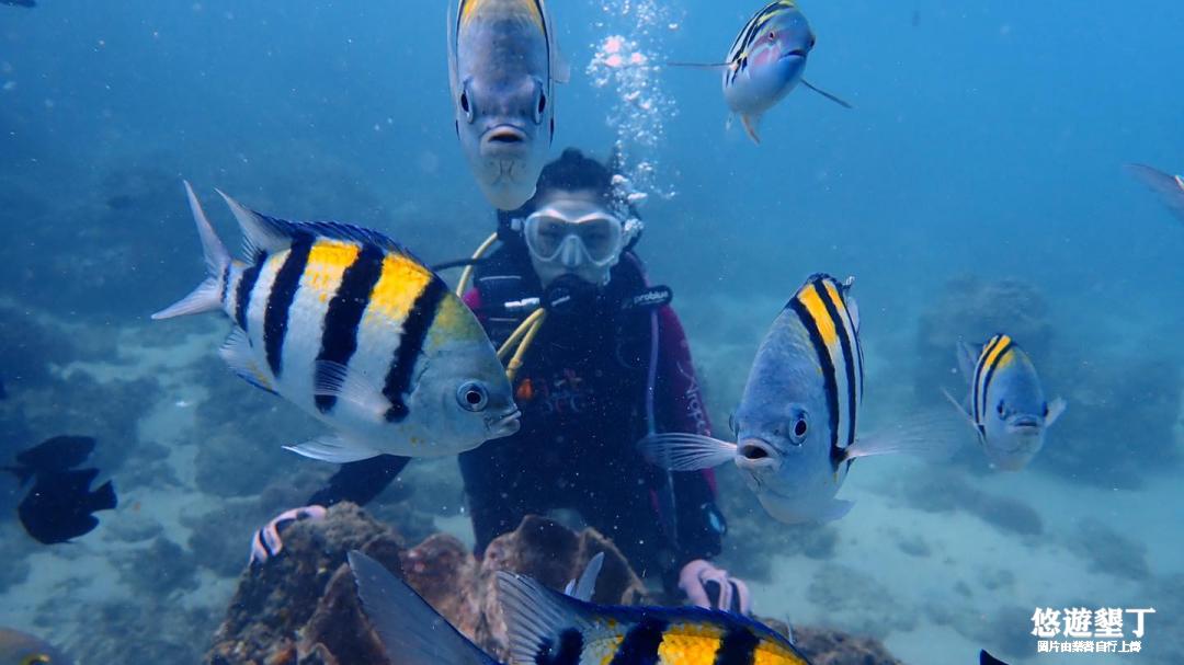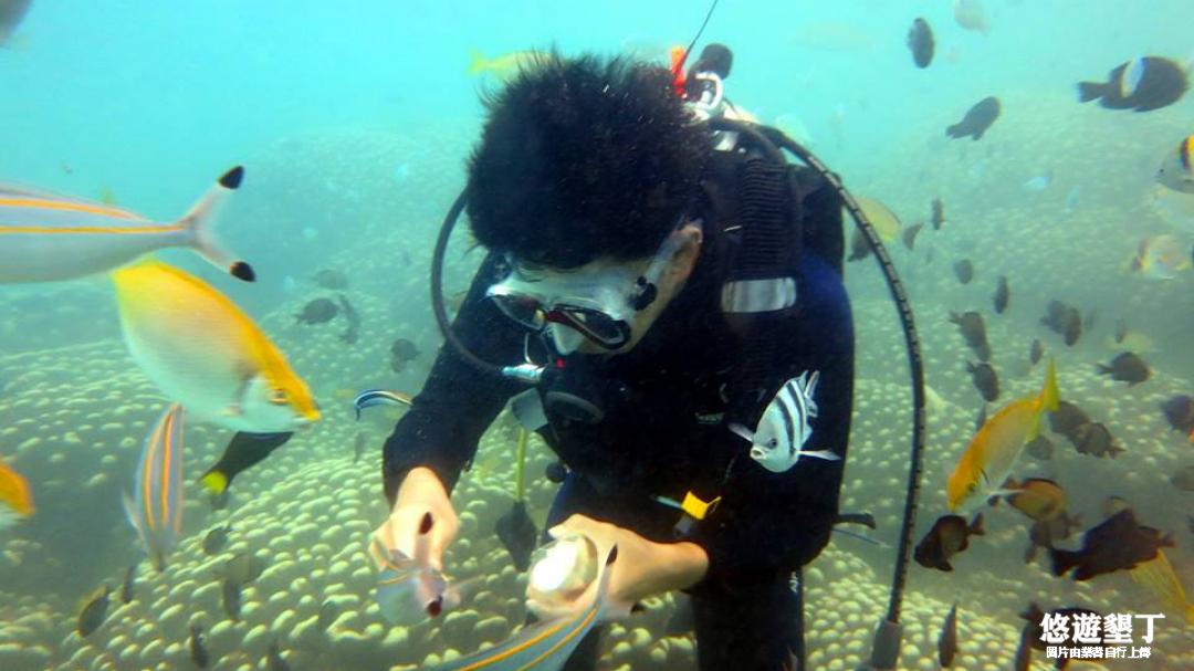 其實今天已經來到墾丁最後一站 早上釣魚活動因為玩得不夠盡興 所以我們臨時微信ATV車的飛哥 看一下還能否加插潛水安排 因為昨天有提及潛水推薦 午餐時段飛哥已經為我們安排好 剛好潛水店就在 #後壁湖遊艇碼頭 附近所以我們吃飯後不用1分鐘就 可以到達 #墾丁舒服潛水 因為k先生還沒有潛水牌 所以只能試玩體驗潛水 體驗潛水其實k先生十年前 在海南島已經試過一回 他形容海南島水底下 全是潛水用的廢棄物 所以今次來到墾丁發現 水底下也絕對沒有受污染 和舒服潛水的教練哥哥 真的非常專業安全 首先細心做一次問卷教學 因為k先生已經有經驗 所以就直接跳過普通用具教學 教練會駕車接送我們去 #後壁湖 這麼是我這3天去過所有 #墾丁 見過最多魚的地方 只是淺水石灘區已經有數十款 海洋生物真的很吸引 k先生還幸運地遇上大大魚一條 哈哈這些可遇不可求 教練成功為他拍下照片